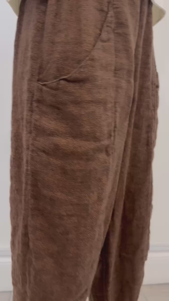 This wide-leg, elastic waist pant tapers at the hem and features deep front inset pockets. Yarn dyed textured woven fabric. 100% Linen Garment dyed. Pre-shrunk. Hand wash or machine wash on a short gentle cycle in cold water. Use mild detergent Dry flat or machine dry low.
