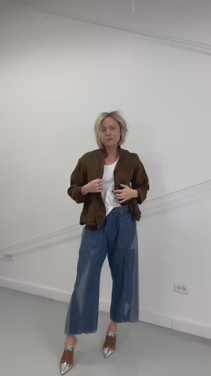 Signature Cynthia Ashby styling. This jacket features a shorter length, front welt pockets that peek out from under the hem, and a pleated hem detail. Yarn dyed textured woven fabric.